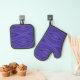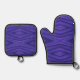 A vibrant purple oven mitt and pot holder set with geometric diamond patterns on the front. The back is solid black. Both have loop hangers.