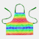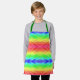 A vibrant, rainbow-patterned apron with green straps displayed on a white background. Below, a smiling child wears the apron over a grey shirt. Bright, cheerful mood.