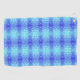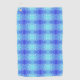A vibrant towel featuring a symmetrical pattern of blue and teal colors, resembling a kaleidoscope. The design is filled with small white dots, creating an energetic and refreshing feel. A small round tag is attached to the top left corner.