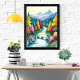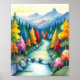 This enchanting artwork depicts a fantastical mountain landscape bursting with an explosion of colours. A serene river, adorned with gentle waterfalls and smooth rocks along its banks, meanders through a valley flanked by majestic, snow-capped mountains in the distance. What makes this scene truly unique are the trees that line the river and dot the hillsides – their foliage is painted in an incredible spectrum of vibrant hues including bright yellow, fiery orange, deep red, fuchsia, turquoise, and various shades of green, creating a mesmerising "rainbow forest." The sky above is a soft gradient of yellow and blue, adding to the dreamlike quality of the piece. This artwork evokes a sense of wonder, joy, and tranquillity, making it a perfect addition for anyone who loves fantasy art, nature, and cheerful, colourful imagery.