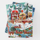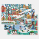 A whimsical winter scene features a lively village with colourful houses, snow-covered trees, and joyful children playing around a cheerful snowman. The sky is filled with decorative stars and snowflakes, adding to the festive atmosphere.