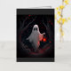 The overall colour palette is dark and moody, dominated by blacks, reds, and whites. The illustration employs a detailed, semi-realistic style with a focus on texture and depth, creating a haunting and immersive scene. The ghost's lantern is the only bright source of light, highlighting the eerie, mystical environment.