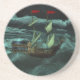 A 3D seascape created in Vue, depicting a small sailing ship with red flags on a storm-tossed sea. The billows are lit with an eerie blue-green light, and the dark clouds above threaten further danger to the ship.