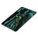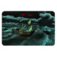 A 3D seascape created in Vue, depicting a small sailing ship with red flags on a storm-tossed sea. The billows are lit with an eerie blue-green light, and the dark clouds above threaten further danger to the ship.