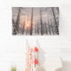 A pale winter sun sets behind towering larch trees like dark sentinels. Their gnarled branches, bare except for a dusting of snow, and the pastel golds, pinks, and blues of the sunset sky are seen as through a dreamy haze. In the foreground snowflakes are softly falling.
