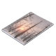 A pale winter sun sets behind towering larch trees like dark sentinels. Their gnarled branches, bare except for a dusting of snow, and the pastel golds, pinks, and blues of the sunset sky are seen as through a dreamy haze. In the foreground snowflakes are softly falling.