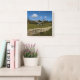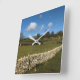 An ancient dry stone wall crosses green fields under a perfect blue sky with fluffy white clouds.