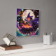A mischievous witch stirs her cauldron, surrounded by vibrant colours, as the full moon casts an enchanting glow over her magical ritual.