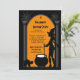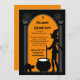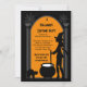 Invite guests to your costume party with this spooky, yet trendy invite. It has a front of a haunted house with the black silhouette of a witch stirring her brew in a big black cauldron pot.