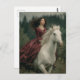 A woman rides a beautiful grey horse wearing a burgandy dress