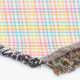A woven blanket with a blue and yellow checkered pattern. The blanket is displayed in both horizontal and vertical orientations, with fringe edges.
