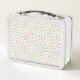 A colourful, retro Alphabet design on a vintage / retro - style lunch box that can be personalised with your child’s name. Text can be added to the front with the Teacher, School grade or other message. Inspired by retro typefaces and boho design, this cover can be personalised with a name, monogram, or other text. Gender-neutral colours; purple, green, orange, yellow, teal, turquoise, grey, brown, cream.