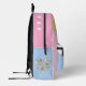 Adorable backpack for a young child features a large heart at the top which is made up of fun, whimsical drawings of things she'll find at school. There's a world globe with a cute face on it, school bus, ruler, paints, pencils, and lots of other cute items. There's even a backpack, which if you look closely, the actual backpack matches! The heart is also on the sides at the bottom and at the top is "A B C and 1 2 3". The front pocket has a template for you to add her name to personalise it. Your precious little girl is going to love this backpack and won't see another one like it!