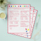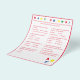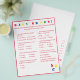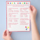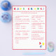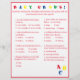 Design features a white background to a red border and red text. Title is displayed in bright colours. Questions are multiple choice and relate to development of Baby. The last question, however, is customisable and is personalised to the Mummy-to-Be. The stenciled letters, "ABC" are displayed at bottom, right corner in primary colours. Answers are found on back. Designed to coordinate with the "ABC Baby Shower Collection." Also available in blue.