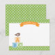 Modern alphabet themed baby shower thank you note cards for a baby boy feature a cute little bird perched on ABC letter blocks, a banner title, a polka dot border, and a contemporary colour scheme of leaf green, sky blue, orange, and mocha brown.