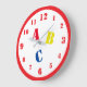 Design features the letters "ABC" in primary colors and large, stenciled font. Clock numbers are displayed in a blue, easy-to-read print. The 12, 3, 6 and 9 slightly larger than the rest of the numbers. Entire design is encircled in a red border. Also available in blue. Coordinates with the "Personalized Alphabet Nursery Collection."
