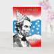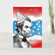 Patriotic birthday party invitation with Abraham Lincoln laughing and wearing a birthday party hat with a red, white, and blue design of stripes and stars behind him. Celebrate, laugh, and party written on the cover. Customise your party information inside as you like before checkout. Art, image, and verse copyright © Shoaff Ballanger Studios, 2022.