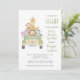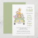Cute baby shower by mail invitation featuring an illustration of baby zoo animals (lion, elephant, zebra, monkey and giraffe) piled into a safari vehicle, "It's About to Get Wild" in fun typography and "Baby Shower" and the name of the mother in a jungle green script. Easily personalise the shower by mail details, change the "It’s a Boy!" text on the vehicle, and add the due date on the license plate, or leave blank.
