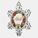 This snowflake-framed ornament features softly layered holly greenery, rich red berry clusters, and classic poinsettia blooms arranged around the name Abril in graceful gold script. At the base of the design, delicate baby shoes are accented with a subtle gold Santa outline, adding a meaningful detail that reflects innocence, wonder, and the early magic of Christmas.