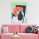Canvas in a modern, Boho style abstract of a vase and table setting in shades of soft aqua, deep coral orange, black and white