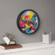 The size of the clock is dramatic and the abstract alcohol ink design is soothing and intricate at the same time. I chose the black frame that adds pop to the blue and gold design. The gold printing would be better in a slightly darker or larger font. I love it and I’m looking for just the right place in ny new apartment. I would recommend this clock for a personal gift or a present. I feel that the quality is excellent for the money! I’m a bit of a clock nut so I’m pretty particular about my purchases. The clock is larger in diameter than many if the clocks I have, so it stands out very well. I think a slightly darker printing color and a moderately larger size would best suit a professional decor or add more impact in a work place item.