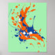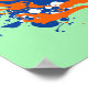 A stylish poster with design of abstract expressionism art paint splash with colours of orange and blue against a mint green background. Arty and funky, this design is colourful and vivid.