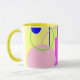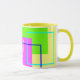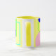 This pretty and bright mug features my original graphic art of lines and shapes in blue, yellow, pink and green tones. It has an abstract style and is reminiscent of the retro era of art. The inside and handle have a harmonising tone of yellow.
