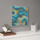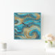 Wall clock with abstract AI-generated picture with swirls and waves of blues, aqua, white, and black.