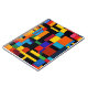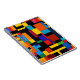 Earth brown, sandy tan, turquoise blue, sunset purple, sunshine yellow, and cactus flower red and pink, interspersed with black lines in rectangular blocks of colour.