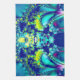 Abstract kitchen towel featuring fractal art in vibrant colours: blue, cyan, neon green, and purple.