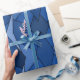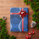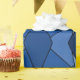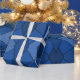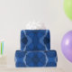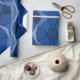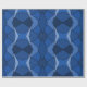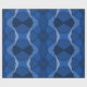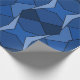 Inspired by stained glass, this stylish design contains abstract geometric shapes in various shades of blue, navy, and light blue outlined in black.