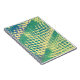 Painting of abstract diamond shapes of blue, green, and purple, on a yellow background is printed on notebooks.