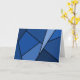 Inspired by stained glass, this stylish geometric design contains polygons in various shades of blue outlined in black. A light blue triangle slashes in from the upper right with an array of progressively darker blue quadrangles and other shapes spiralling around it from light to dark. Two dark blue shapes ground the left side of the original design.