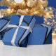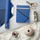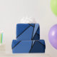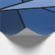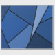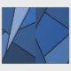 Inspired by stained glass, this stylish geometric design contains polygons in various shades of blue outlined in black. A light blue triangle slashes in from the upper right with an array of progressively darker blue quadrangles and other shapes spiralling around it from light to dark. Two dark blue shapes ground the left side of the original design.