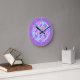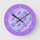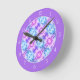 Abstract blue and purple snowflake pattern with border round clock. It showcases a geometric pattern made of abstract snowflakes in blue and purple. There is a purple lavender border around it with the numbers.