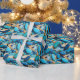 Add a unique, nature-inspired touch to your gifts with this abstract wrapping paper. The design features an array of soft, round pebble shapes in varying shades of vibrant blue, appearing to float against a textured, undulating background of light blue and light brown. Subtle gold lines highlight the many pebbles, adding a touch of elegance. This eye-catching pattern blends natural shapes with modern aesthetics, making it perfect for wrapping holiday gifts, thank-you cards, or any other occasion.