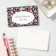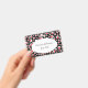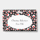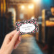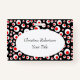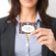 This name or identification badge has a bright abstract circular pattern of white circles with smaller red circles inside on a black background. Customise your name and information in the white oval with the templates.