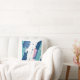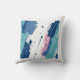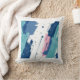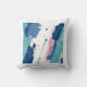 This image showcases a square, white throw pillow featuring an abstract design of bold brushstrokes in varying shades of blue, teal, and pink. The pillow is displayed against a light grey background, emphasising the vibrant and modern pattern.