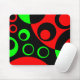An exciting and fun abstract design made up of circular bubble like shapes in vibrant contrasting red and green with black.