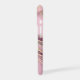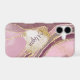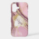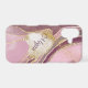 On this pretty phone case for her, soft pink combines with muted maroon and a bit of tan grey to form a unique marbling effect. Gold faux glitter lines separate the colours. Her name is in matching burgundy maroon over a gold glitter lined banner at the centre.