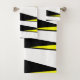 The towel set shows a three coloured nonparallel stripes design in black, white and yellow. It is an abstract resemblance of a Monarch butterfly caterpillar. For customisation enquiries please contact info@KBMD3signs.com