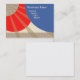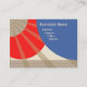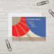 The business card has an abstract design in the colours of cream, red, blue and a tan digital design with rays.