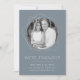 Share the news of your engagement in style with these elegant engagement announcements! The announcement features your engagement photo encircled by faux gold abstract circles on a dusty blue background. "We're Engaged!" is displayed in white modern lettering with your name and details below.