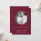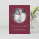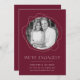 Share the news of your engagement in style with these elegant engagement announcements! The announcement features your engagement photo encircled by faux gold abstract circles on a wine-coloured background. "We're Engaged!" is displayed in white modern lettering with your name and details below.