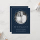Share the news of your engagement in style with these elegant engagement announcements! The announcement features your engagement photo encircled by faux gold abstract circles on a navy background. "We're Engaged!" is displayed in white modern lettering with your name and details below.