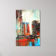 Abstract cityscape with tall, colorful skyscrapers evokes a sense of urban dynamism. The blend of blues, reds, and oranges creates a vibrant atmosphere.