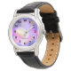 An elegant personalised watch with a nice combination of soft pastels and bright colours. A colourful abstract painting with a cosmic space image in pink, purple and yellow watercolors. The colours blend and mix together creating luminous ethereal clouds with little twinkling stars peppered throughout.