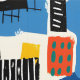This artwork features a dynamic and eclectic composition of abstract shapes, patterns, and textures, layered together in a collage-like arrangement. The design incorporates bold colours such as blue, yellow, red, and black, with each element varying in size and form. Hand-drawn lines, grids, and brushstrokes add a playful and spontaneous feel to the piece, while the irregular arrangement of the shapes creates a sense of movement and energy. The combination of geometric forms and freehand marks gives the artwork a modern, artistic vibe.