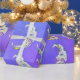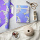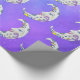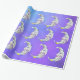 This wrapping paper has white abstract crescent moons decorated with colourful markings in blue, yellow, and purple, yellow stars with pretty faces on a mixed purple and blue sky background with dotted white stars.