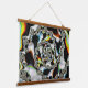 This hanging tapestry features an abstract psychedelic spiral fractal art in black and white with yellow, orange, blue, and green accents.